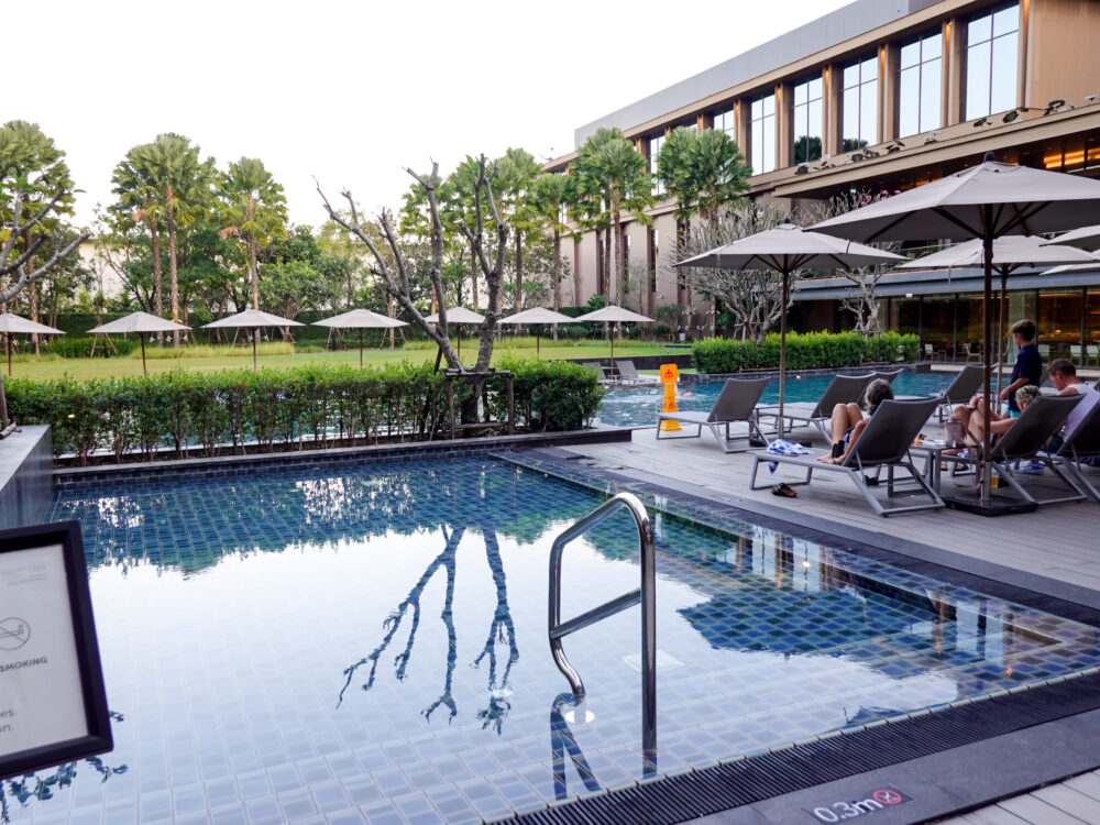 ホテルのプールは南国リゾートのよう。多くのゲストの方がゆったりと過ごされていました。