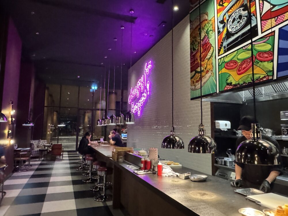 シェフがパティを焼いている姿をライブキッチンで見ることもできます。