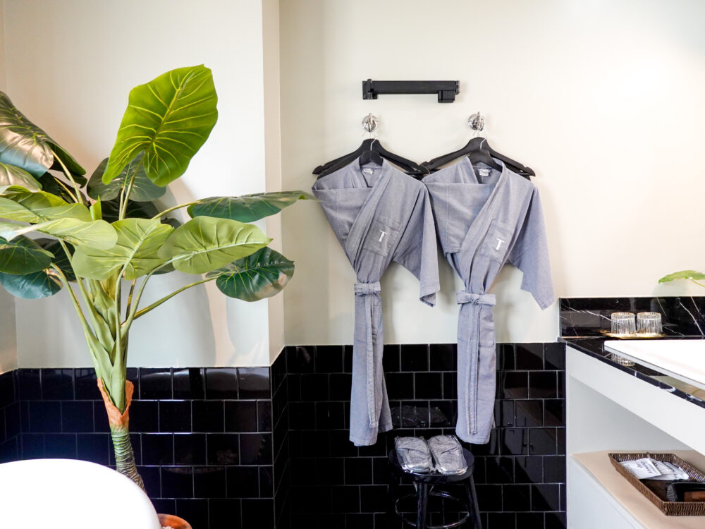 バスローブもシックなデザインで気に入りました。胸元のTマークがポイントです。