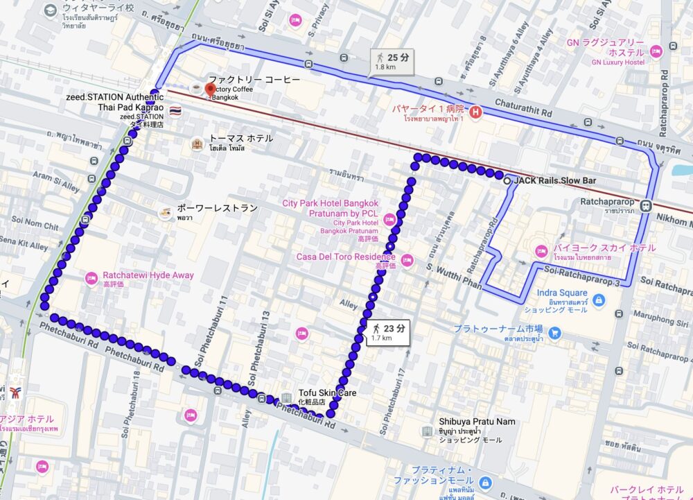 パヤタイ駅からGoogleマップでルートを確認すると、ぐるっと遠回りして徒歩20分以上。