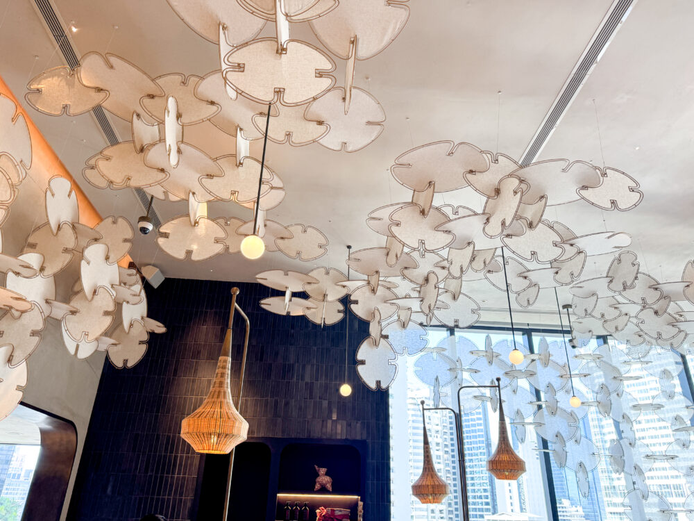 天井からぶら下がる金属製のアートワークは、ベタ(闘魚)のエレガンスさを表現してるんだそう。