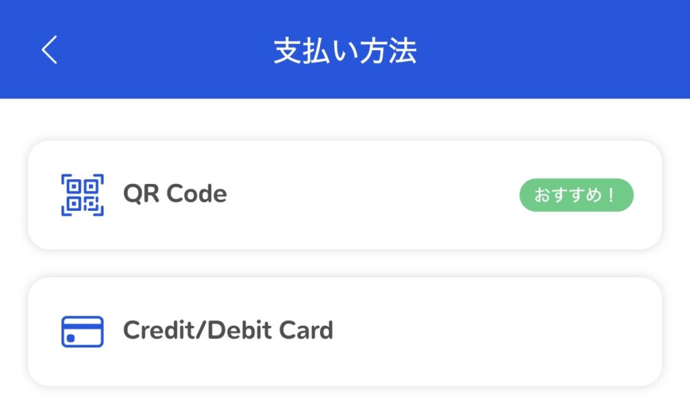 チェージ方法は、QR決済とクレジットカードの2種類。旅行者の方はクレジットカードでの支払いが良さそうですね。