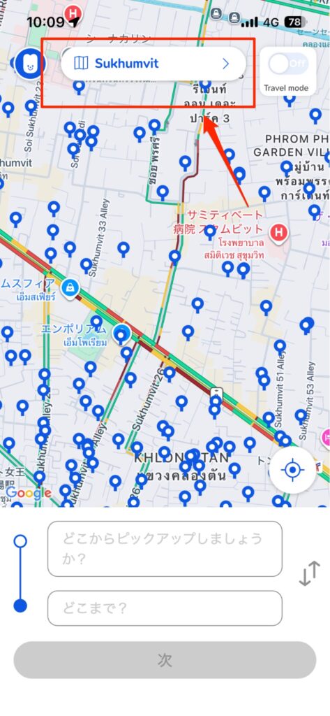 通常のトゥクトゥクと同じように、乗車地と降車地を指定。