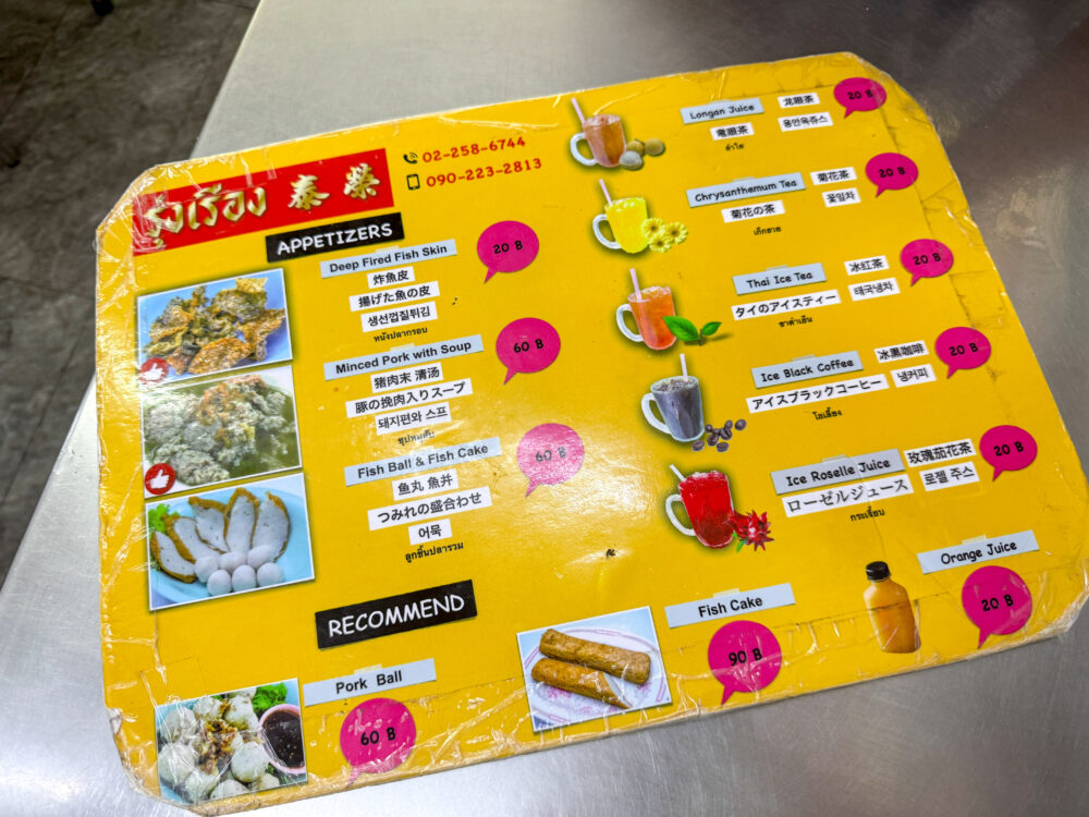 壁には歴史を感じさせる写真や、タイ語・英語・日本語・中国語などが併記された分かりやすいメニューが貼られています。